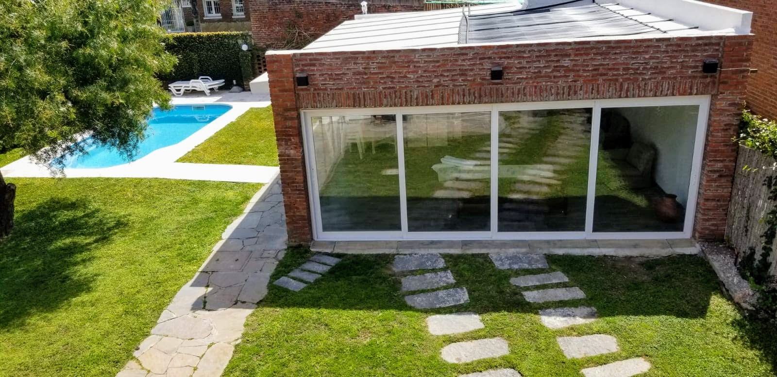 Barbacoa vidriada (40 mts) con vista hacia el deck y jardín con piscina climatizada (solar), reposeras.