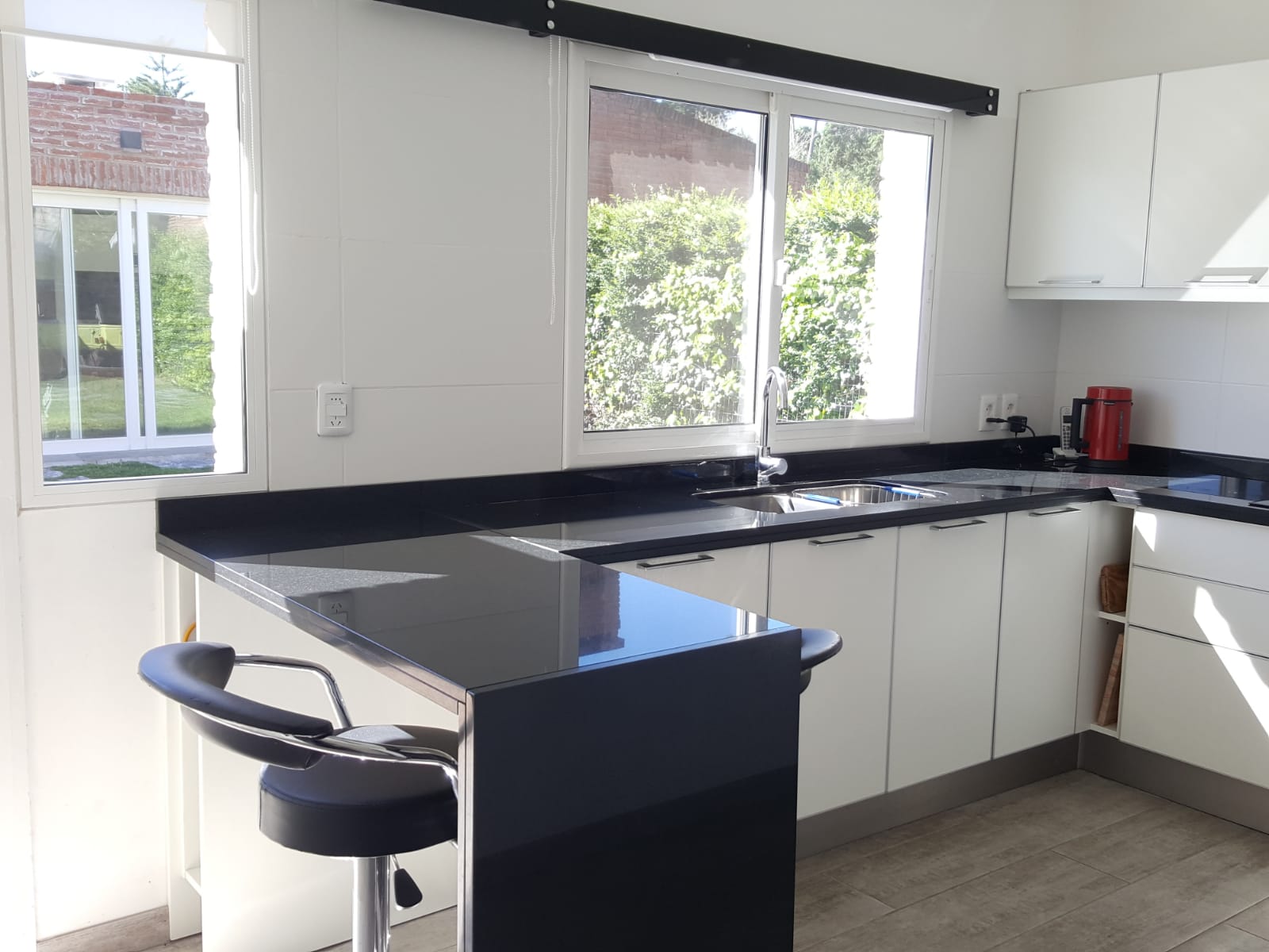 Cocina moderna y luminosa de 20 m2 con desayunador, anafe, horno eléctrico (convector), heladeras con freezer, microondas, lavavajilla, lavarropa y juegos de vajilla para 12 personas.